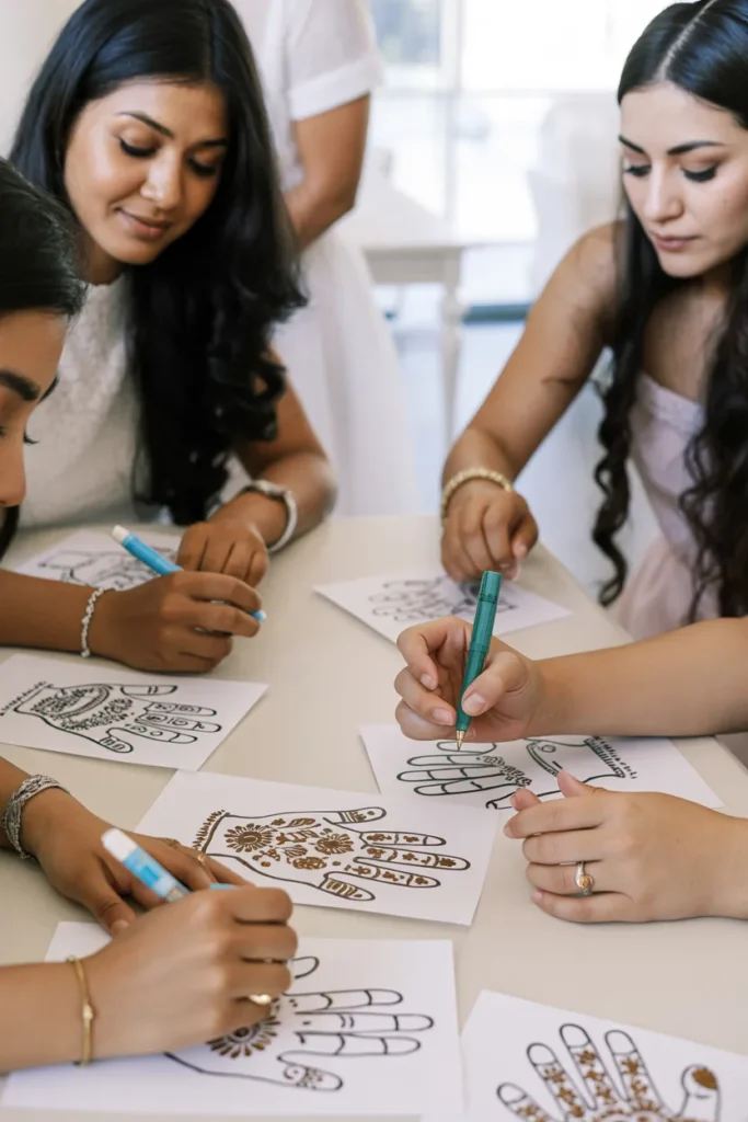 I recommend this for cultural or fusion bridal showers. Guests get hand outline sheets and create their own mehndi designs. It’s relaxing, creative, and gives the bride something memorable to keep.