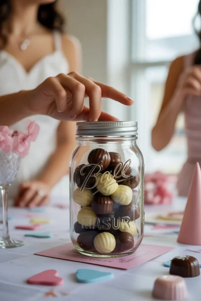 This is one of the easiest games I include, and it doubles as decoration. I fill a jar with chocolates and ask guests to guess how many are inside. It runs quietly in the background, so people can participate anytime without stopping other activities.