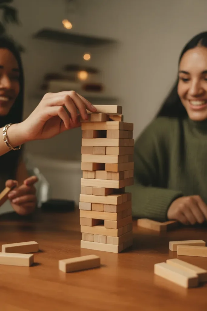 Jenga is always a hit. I set it on a low table and use soft lighting to make it feel cozy but playful. Everyone leans in for that suspenseful block removal moment, and it usually ends in laughter.