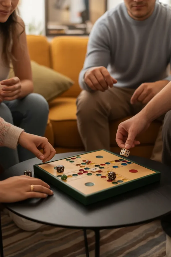 Ludo is perfect for relaxed nights. I place the board in the center and add warm lamps or fairy lights for a soft, inviting glow. It’s low-stress but still fun, and everyone can enjoy casual competition.