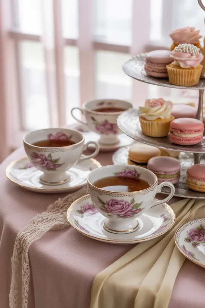 Set up a calm and elegant space with teapots, floral decor, and lace cloths. Serve tea, sandwiches, and scones for a classic feel. Keep the setup light and airy.