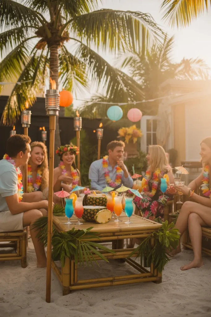 Create a tropical vibe with tiki torches, leis, and palm decor. Serve fruity drinks and grilled food while playing island music. Add fun games like limbo for energy.