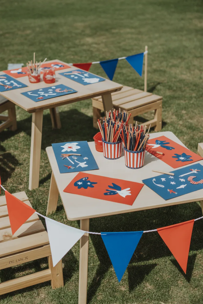 Set up a small table with simple crafts like paper flags or coloring sheets. From experience, kids stay engaged longer when they have something hands-on to do.