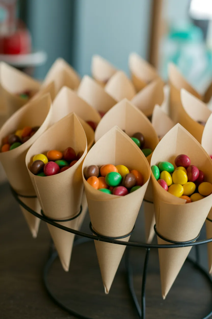 Pre-filled cones make it simple for guests to grab something sweet without crowding the table.