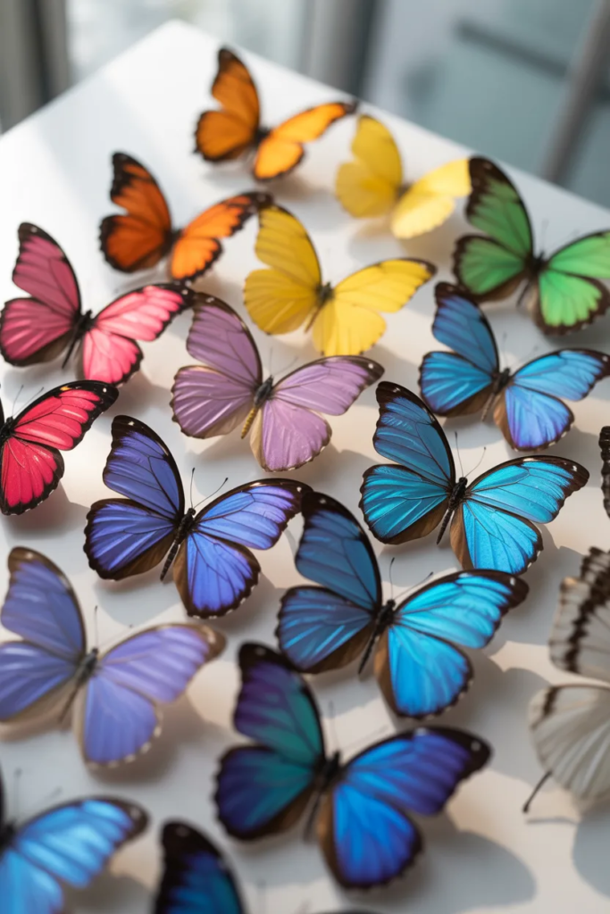 Cut out multiple butterflies using different colored paper and arrange them in a rainbow pattern.