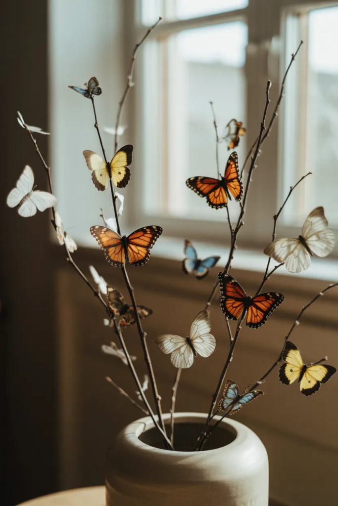 Create a small decorative tree using branches and attach butterfly cutouts to them.