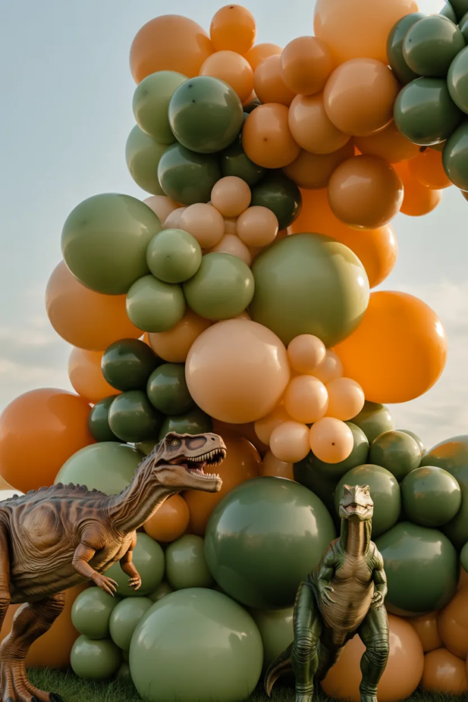 Mix different balloon sizes and colors like green, orange, and gold. Add a few dinosaur cutouts or toy figures at the base for detail.