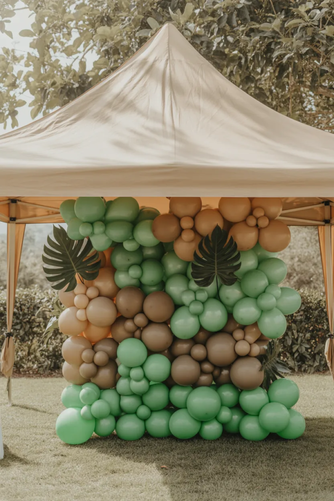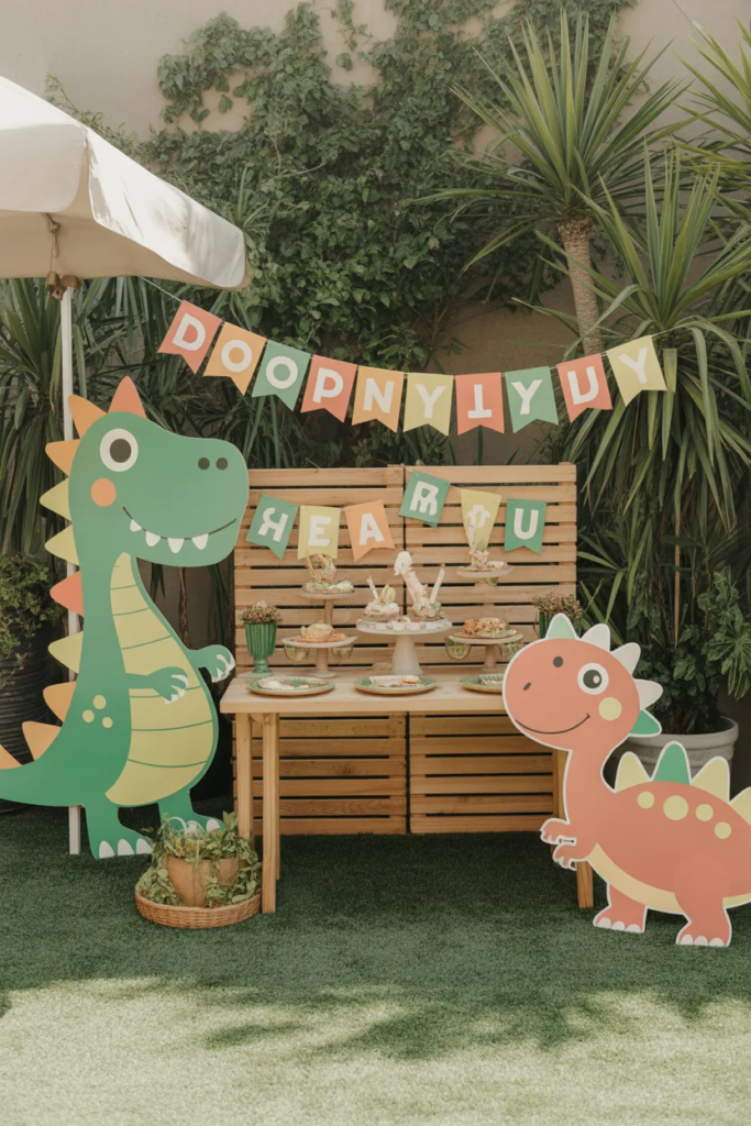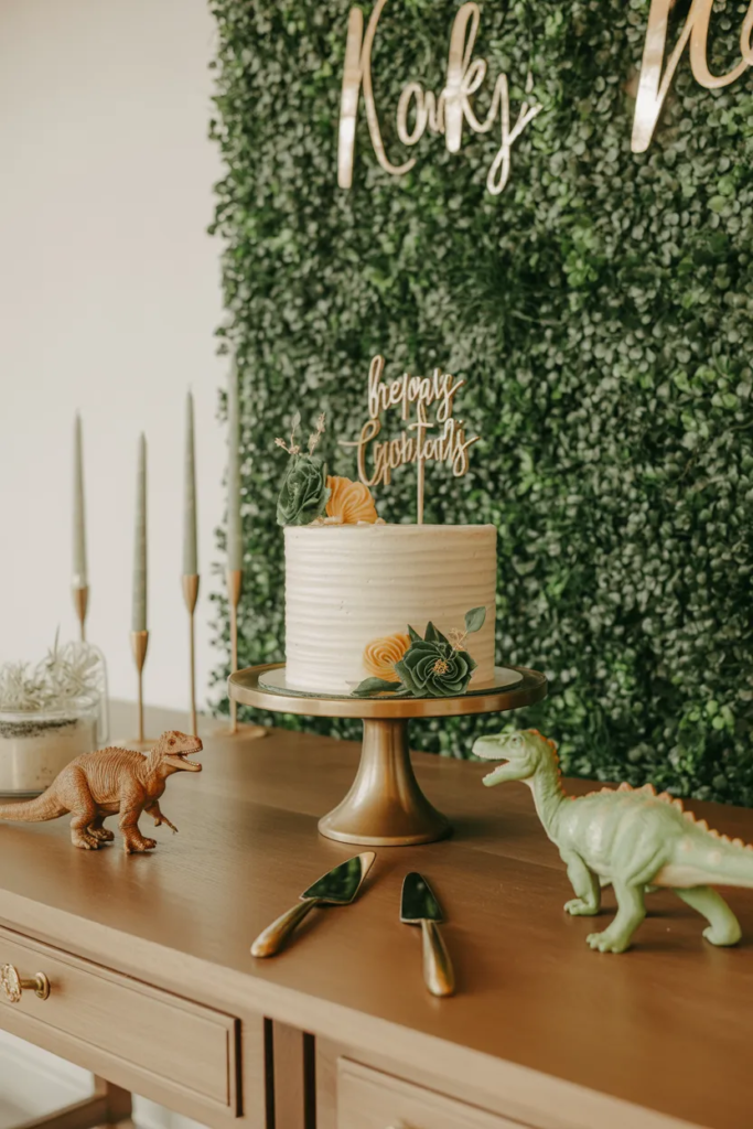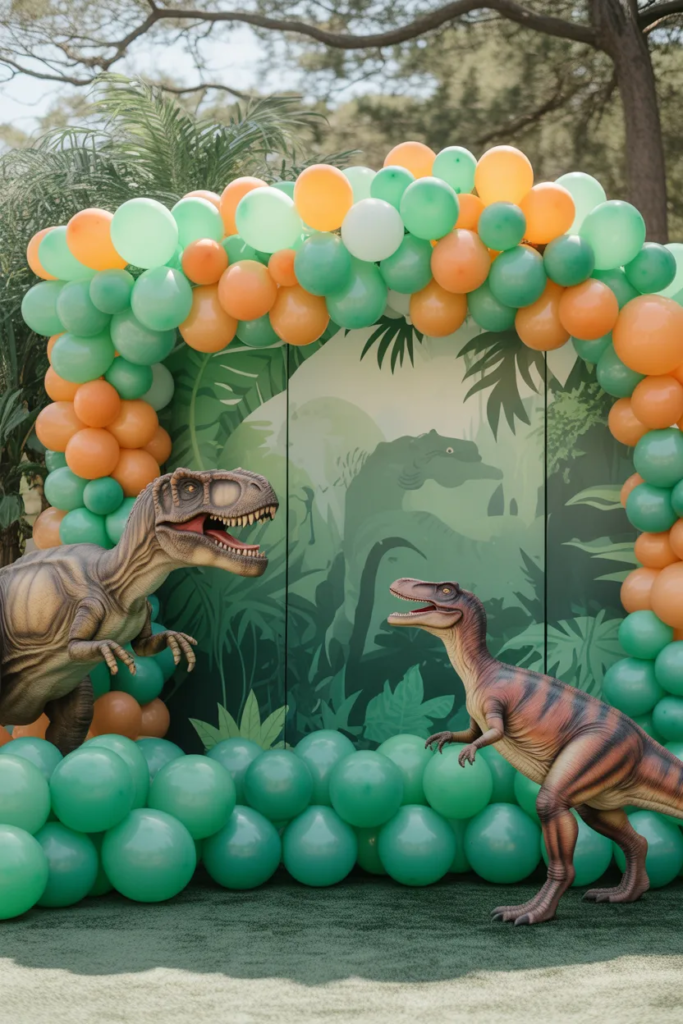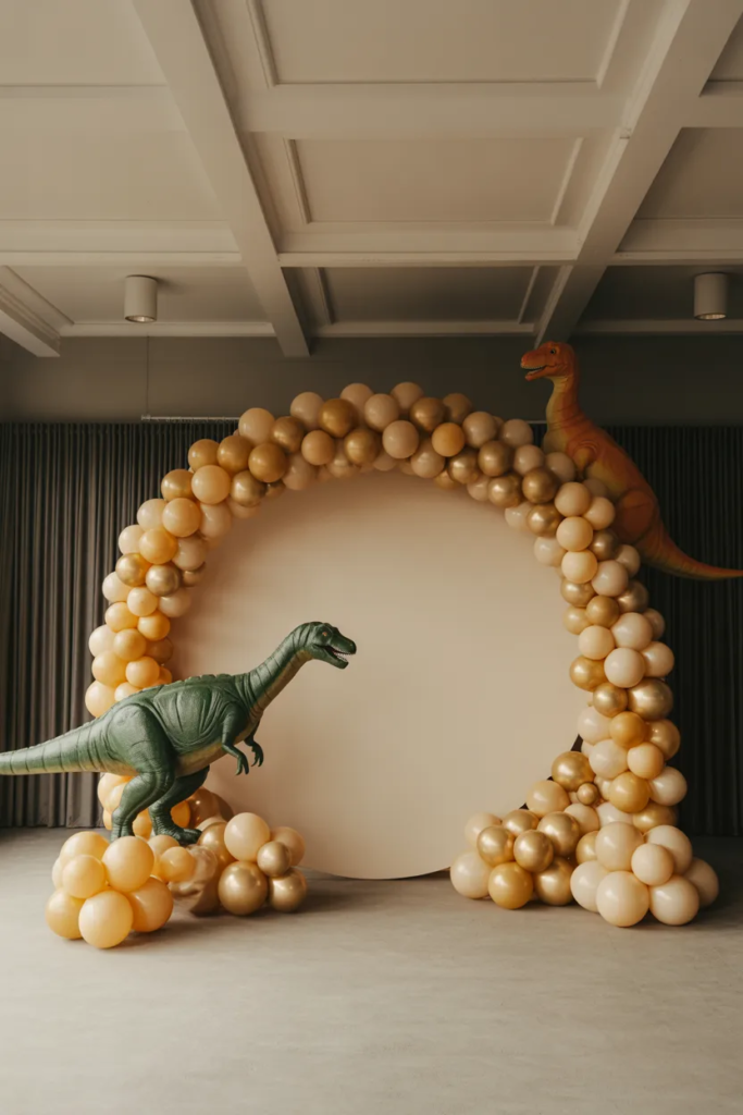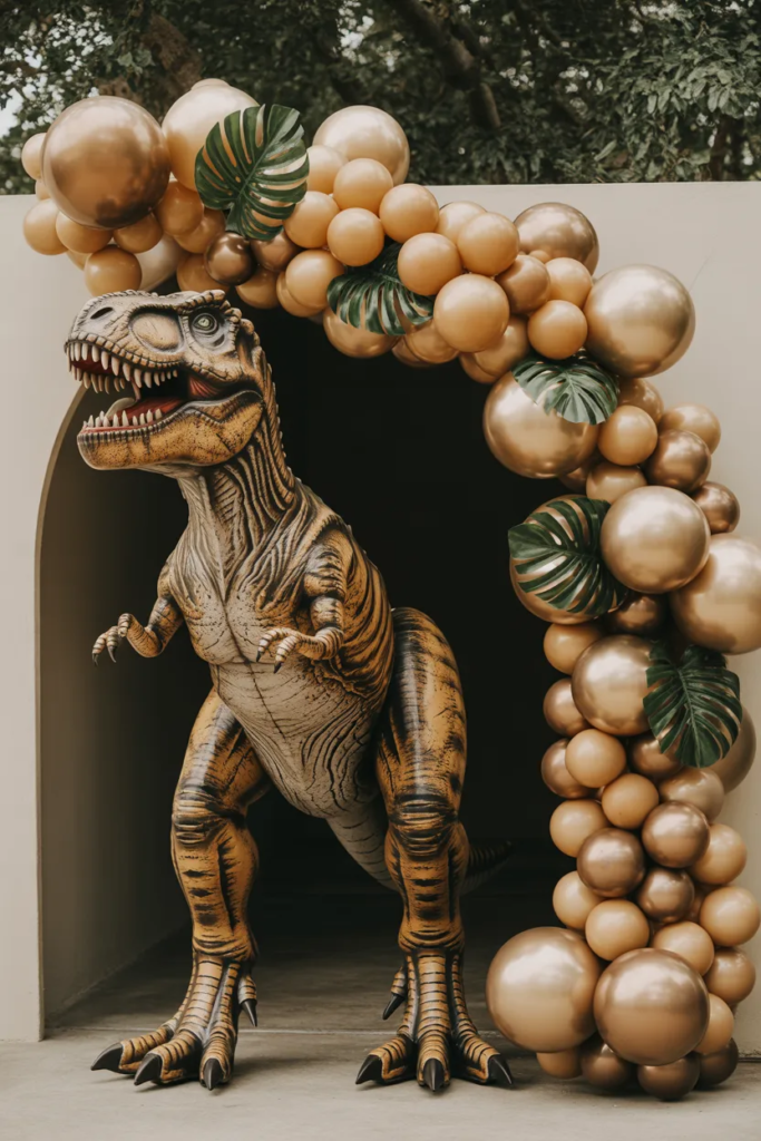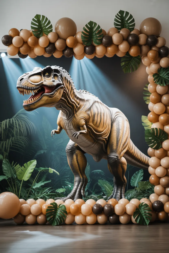 A large T-Rex cutout paired with a balloon garland creates that “wow” moment. Stick to earthy tones for a jungle vibe.