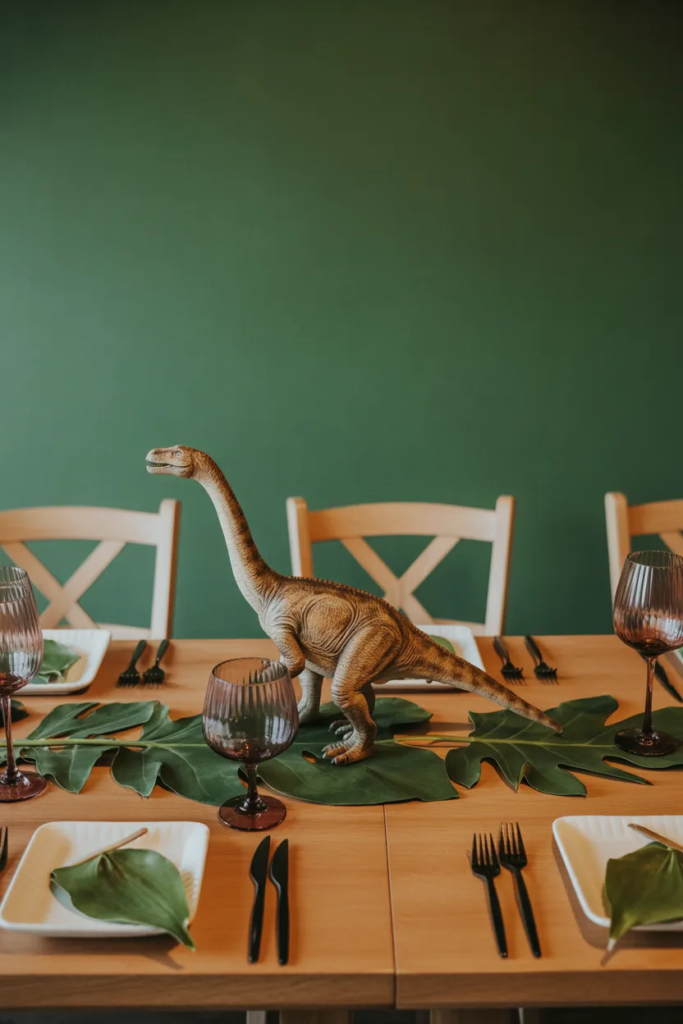 Use green tones, leafy decor, and small dinosaur centerpieces.