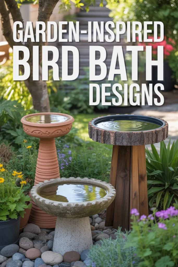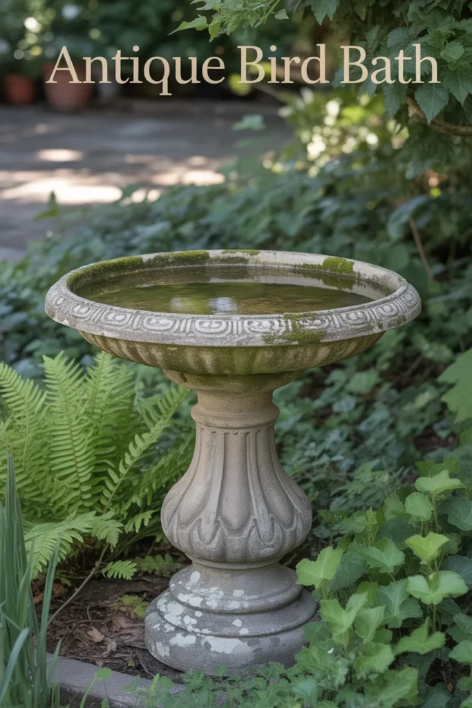 I like using vintage-style bird baths with aged finishes. They blend naturally into plants and flowers. The worn look adds character. Birds use them easily because they are stable.