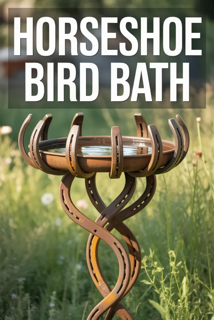 I reuse old horseshoes to form a spiral stand for a bird bath. I usually paint it for durability and style. A shallow bowl on top gives birds a stable place to drink. It also adds a strong rustic feel to the garden.