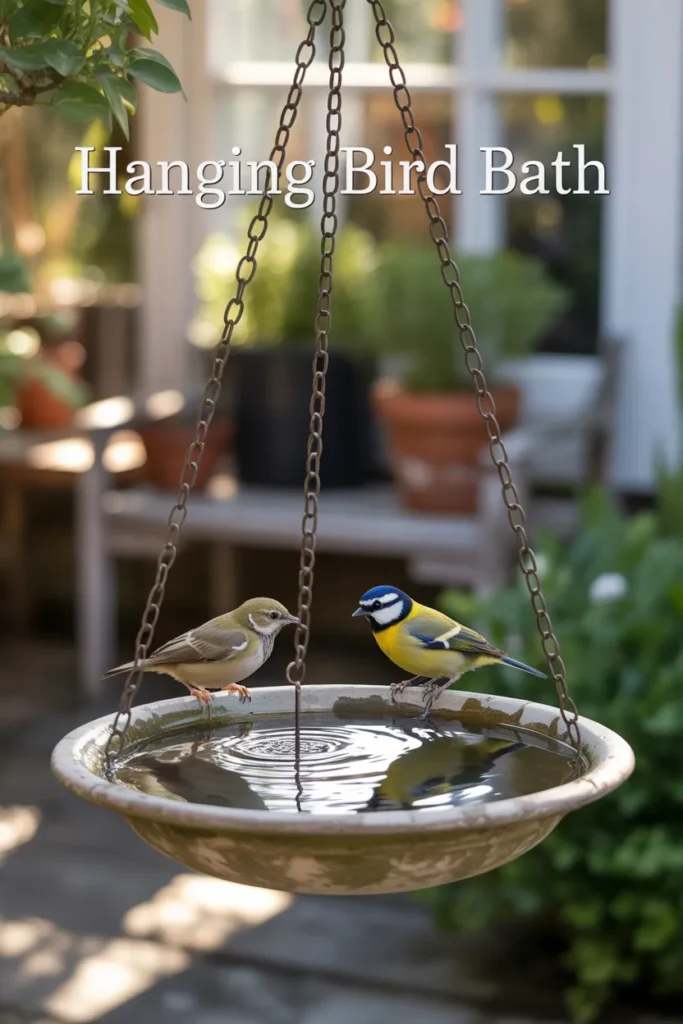 I sometimes hang bird baths using chains for movement. Birds enjoy the slight motion. It works well in small spaces like patios. I always place it in shaded areas to keep water fresh longer.