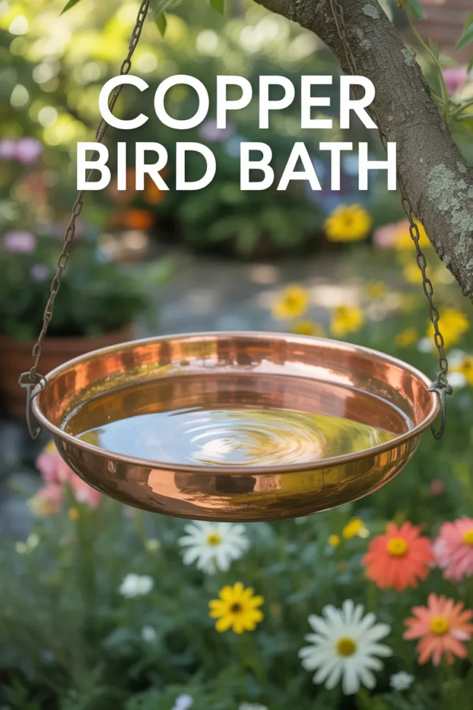 I use copper bowls because they reflect light beautifully. Birds are often attracted to shiny surfaces. Hanging the bowl makes it more visible. It also blends well with flowering plants.