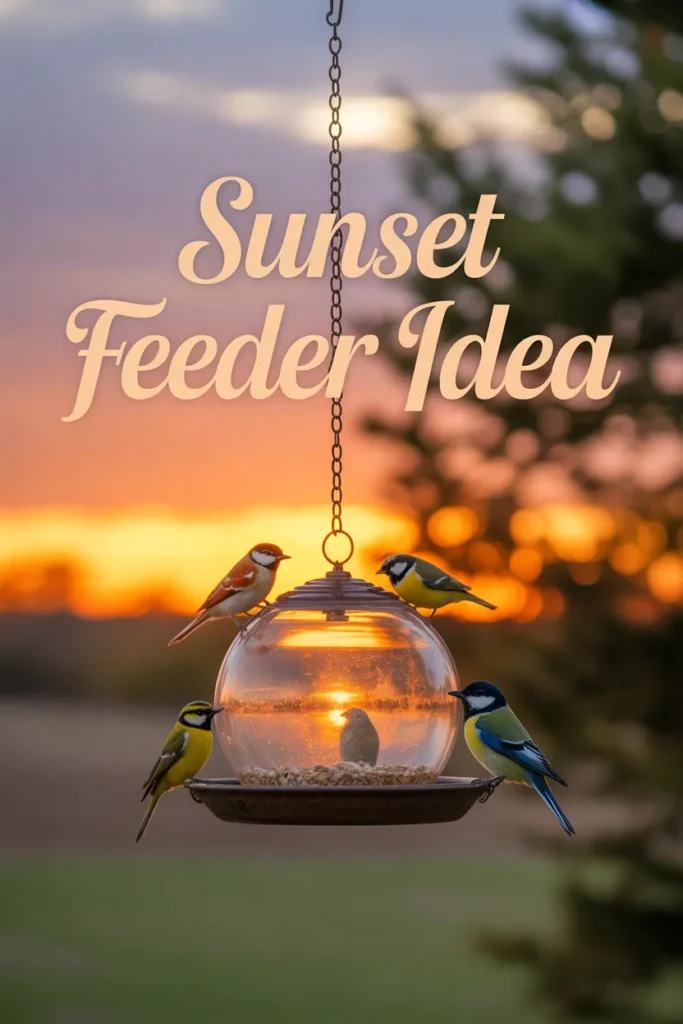 The orb-shaped feeder reflected sunlight during evening hours. I noticed more bird visits during sunset because of the warm light effect on glass.