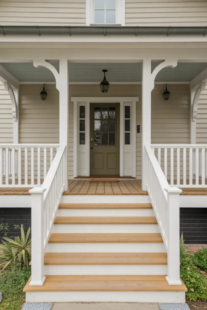 This style feels simple and welcoming. Light stone steps with basic railings create a soft look.