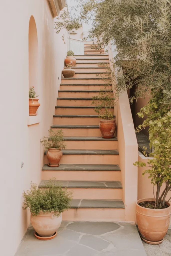 I like this style because it feels warm and relaxed. Stone steps combined with terracotta pots create a natural look.