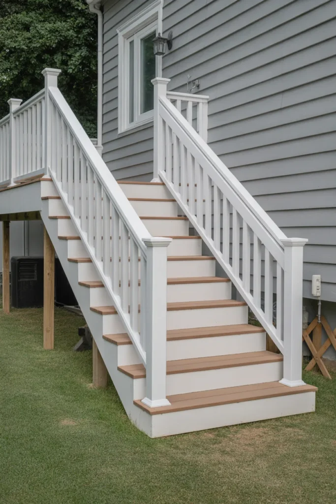 This is one of the easiest designs I’ve tried. Wooden steps with white railings always look clean and simple.