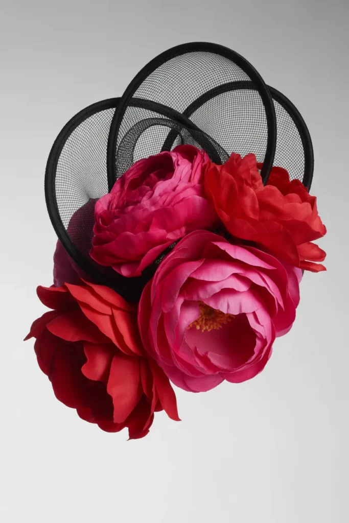 I like this design because it combines vintage and modern elements. I usually start with a soft pink base and add cream and black mesh for contrast. A black net veil completes the look. This style works well for afternoon events where subtle elegance is needed.