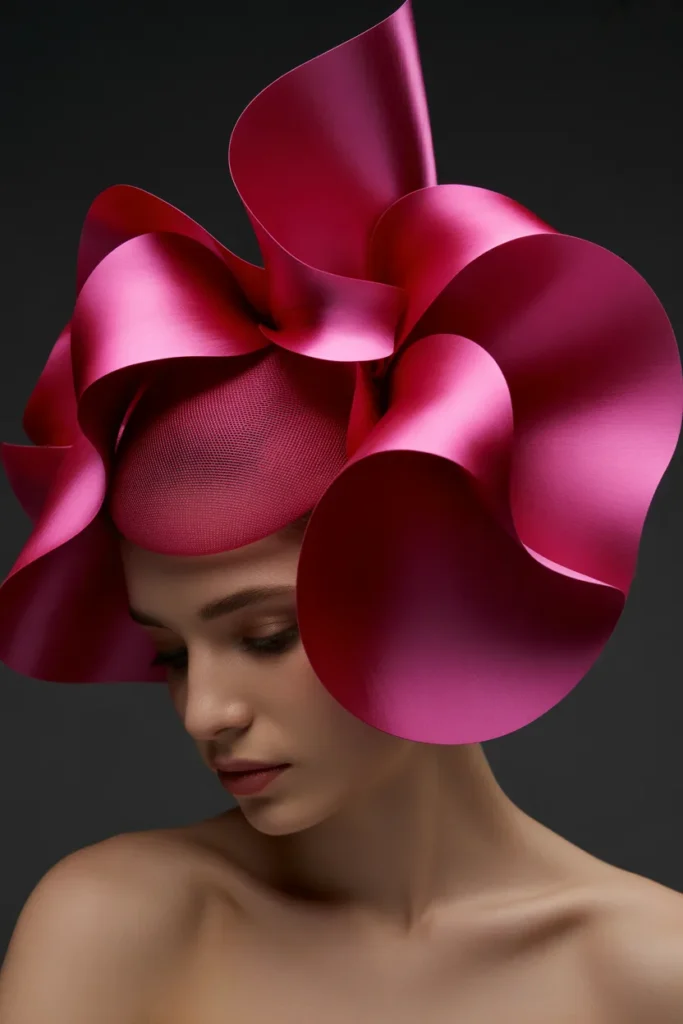 This is a bold and high-fashion design. I use oversized fuchsia petals to create a dramatic effect. It works best for major fashion events or race days.