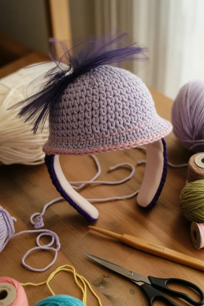 This design feels playful and handmade. I crochet a small hat and attach it to a headband, then decorate it with yarn and tulle. It’s perfect for costume parties and fun events.
