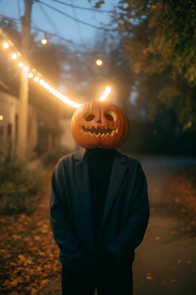Use carved pumpkins as masks and dress in all black. Add a few string lights and you’ve got a simple but striking setup.