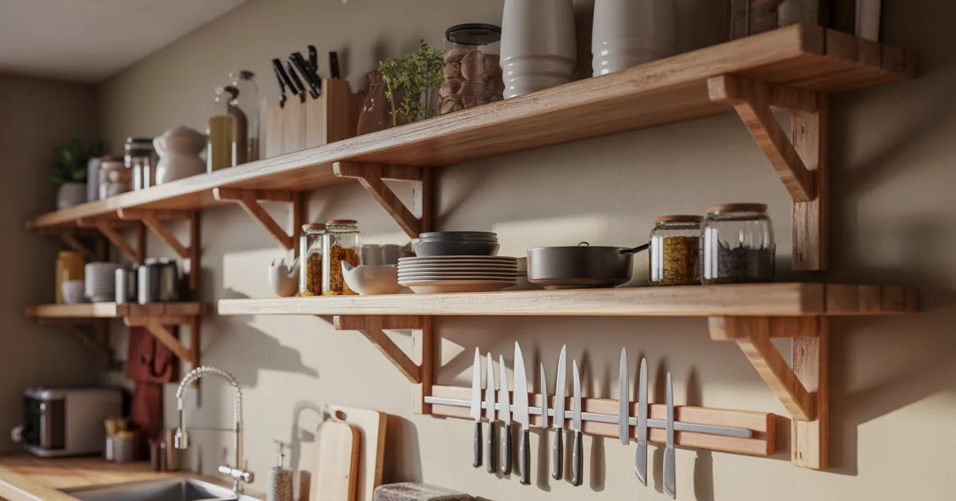 Layering simple wooden shelves is both functional and visually warm. The lower shelf can hold everyday items, while the higher shelf stores decorative or less-used items. Adding a magnetic strip underneath keeps knives handy. Placing these shelves near your prep area creates a cozy, organized wall without cluttering the kitchen.