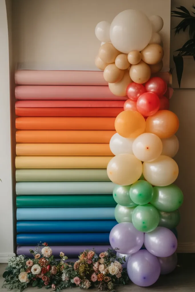 Stacked rainbow panels and balloons create depth for stunning photos. Place larger balloons together first, then fill gaps with smaller ones. Add flowers at the bottom to soften colors and make the arrangement feel stylish rather than cluttered.