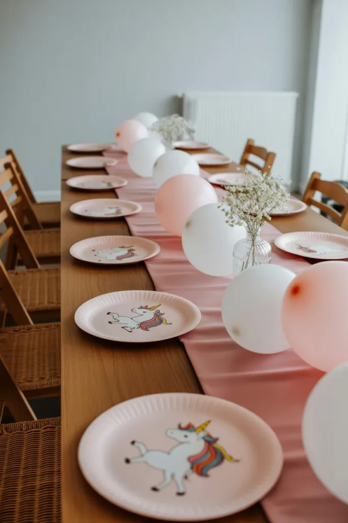 Long pastel table runners with small chairs give kids a sense of importance. Simple, lightweight decorations like small vases and pastel balloons keep tables fun without blocking views. Unicorn cutouts add charm and photo opportunities.