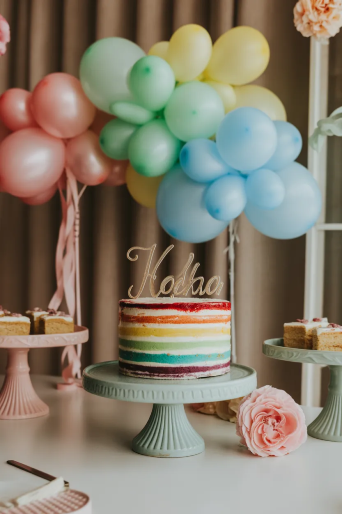 The dessert table is a visual centerpiece. Layer cakes, cupcakes, and balloons in rainbow colors, balancing heights for a dynamic display. A grass or green backdrop makes pastels pop, and simple flower accents prevent the table from looking cluttered.