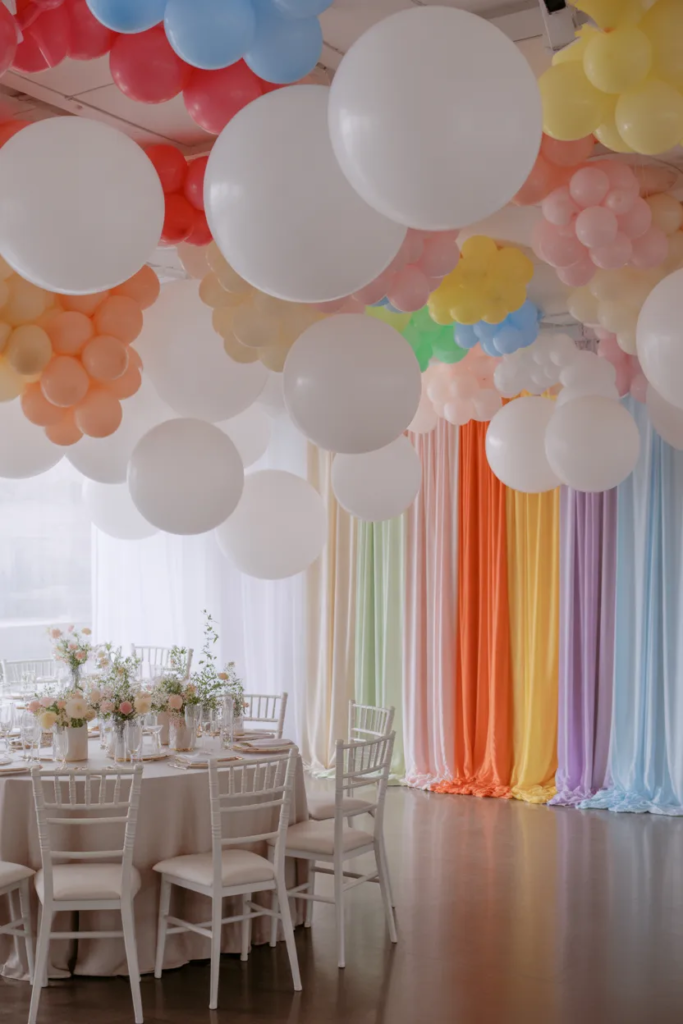 Turn the party space into a storybook scene. Use soft rainbow panels, white floating balloons, and pastel clusters. Hanging balloons overhead frees up floor space, while big rainbow cutouts behind the dessert table provide structure and focus. White chairs keep the room looking clean and bright.