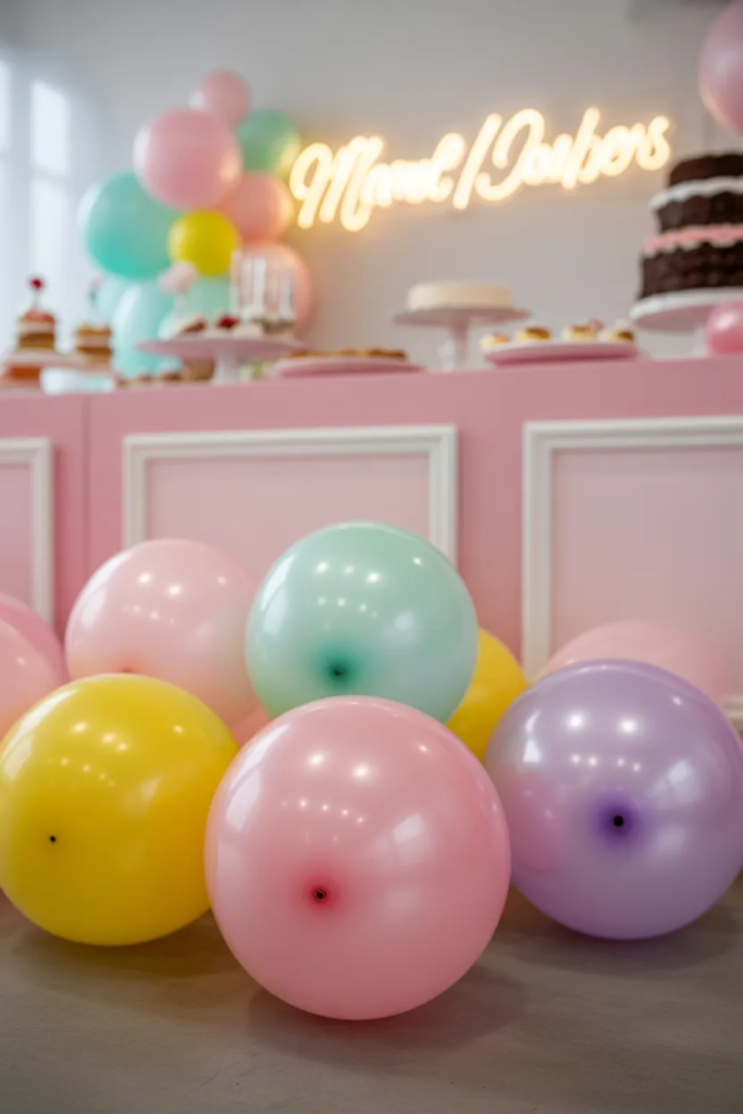 Scattering pastel balloons on the floor makes the party interactive and playful. Keep the dessert table organized and leave space around it for safety. Neon-style name signs and cake pedestals add modern flair without clutter.