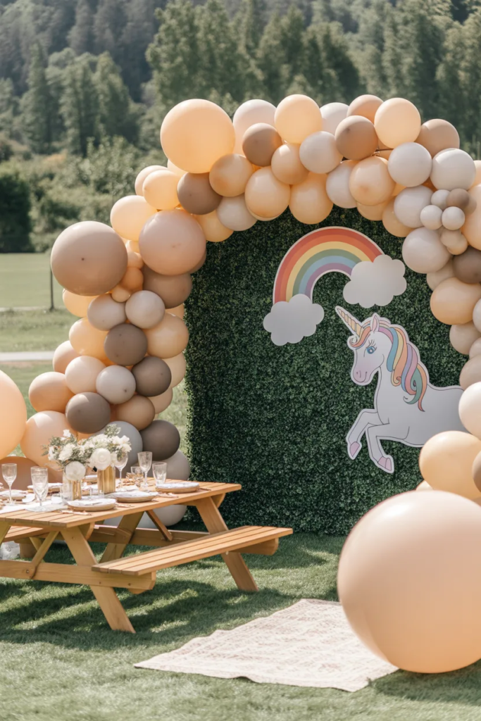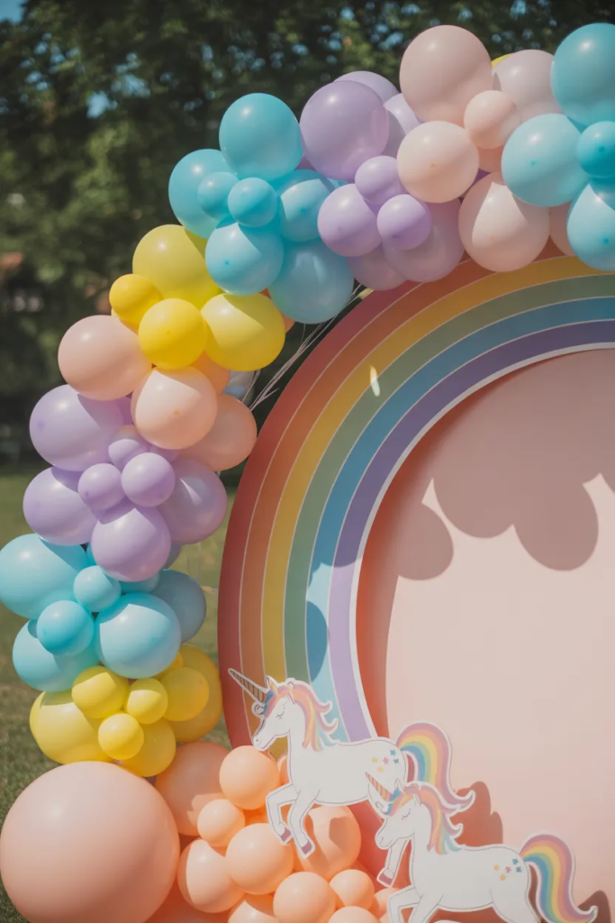 Natural light enhances pastel decorations. Use a simple backdrop and a strong balloon curve to create a tidy, playful setup. Position decorations in partial shade to prevent colors from fading, and add unicorn cutouts for extra fun in photos.