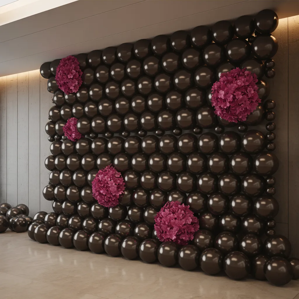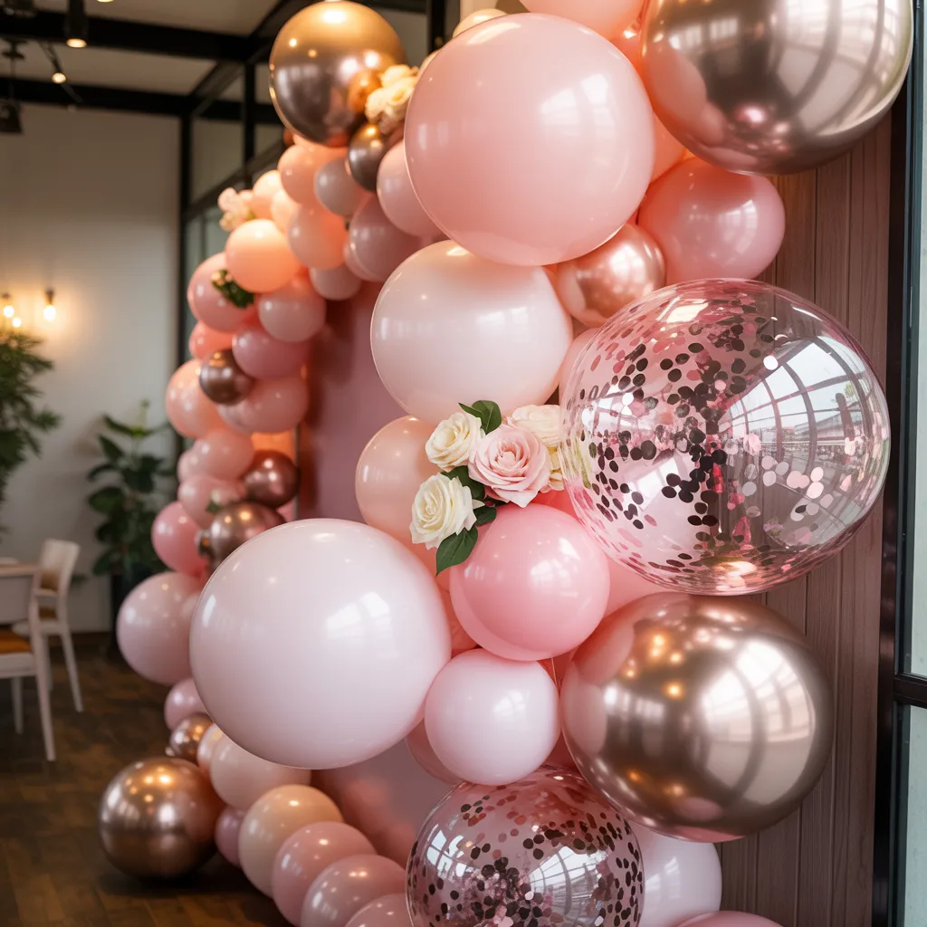 This setup works well when I want something softer but still elegant. Layering pink and rose gold balloons creates a clean visual. I usually add a small floral touch to balance it. Lighting at the base makes the colors stand out more in photos.