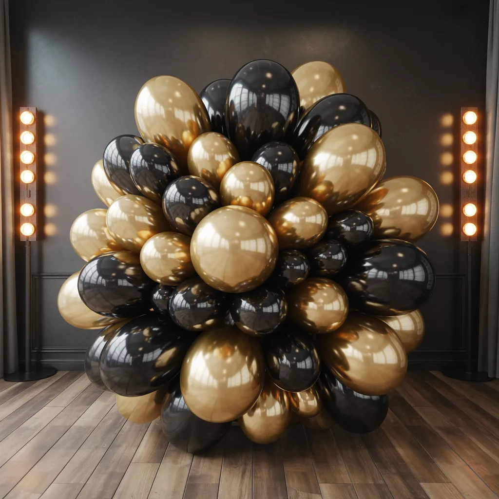 This is one of the easiest ways to create a high-end look. The shimmer effect adds depth. I usually pair it with simple balloons. A spotlight makes the gold stand out more.