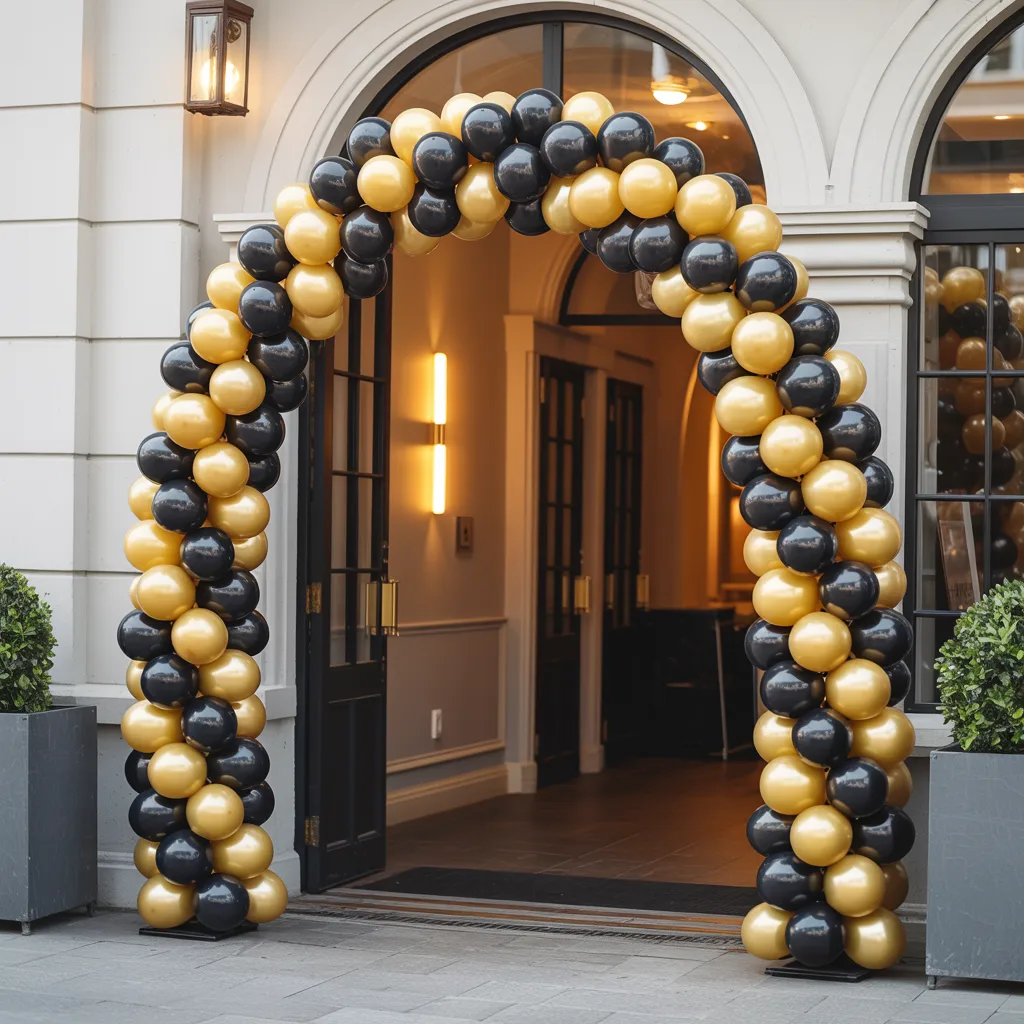 I like using black and gold at the entrance because it instantly feels classy. Mixing balloon sizes adds depth without extra effort. A simple welcome sign completes the look. Adding warm lighting at the base helps the gold stand out and makes the entrance feel polished.