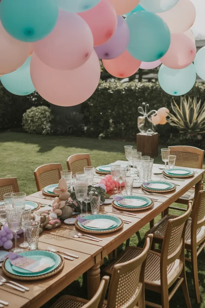 For outdoor parties, I keep things simple. Clean tables with pastel balloon accents work best. Adding string lights later in the evening creates a warm and inviting atmosphere.