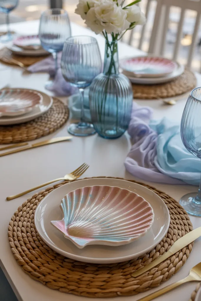 This is a more subtle setup that still looks beautiful. I prefer using neutral tones here. Adding textures like nets or starfish makes it feel more detailed without extra cost.