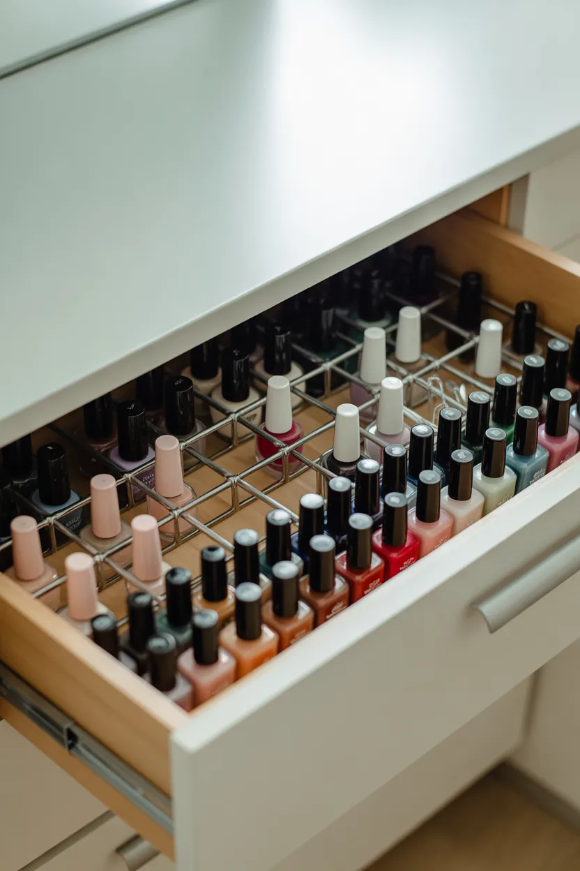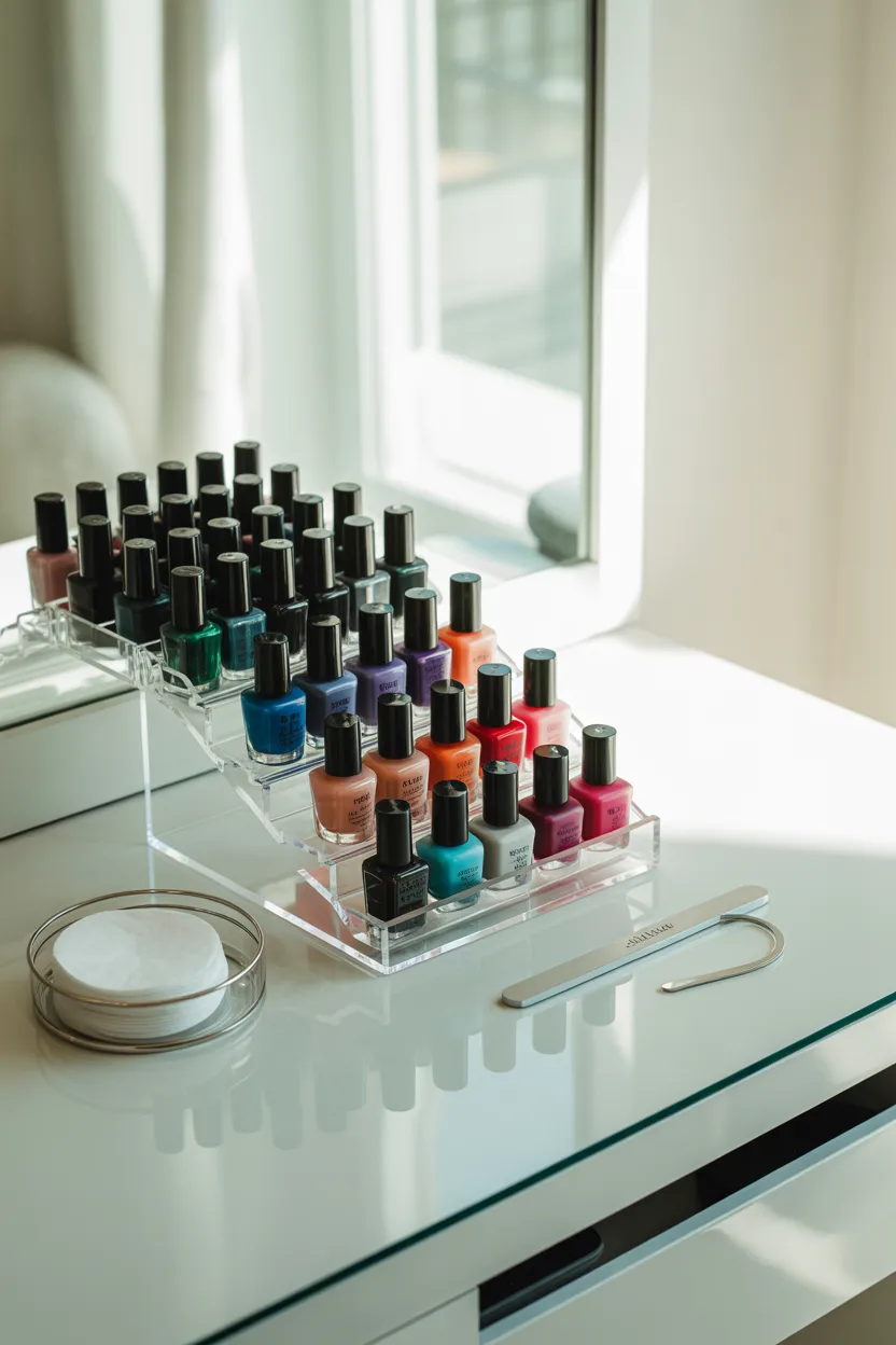 Having a dedicated nail desk keeps everything in one place. I store polishes above and tools below.