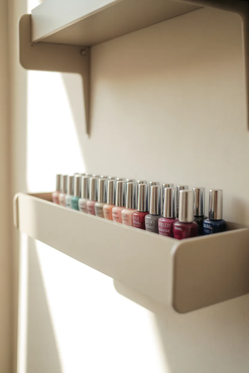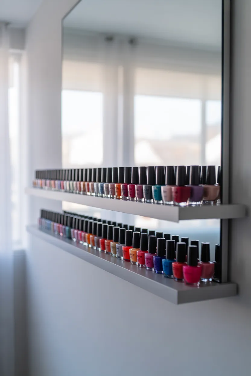 Turning empty wall space into storage was one of the best decisions I made. Floating shelves allow me to line up all my polishes without using my vanity space.