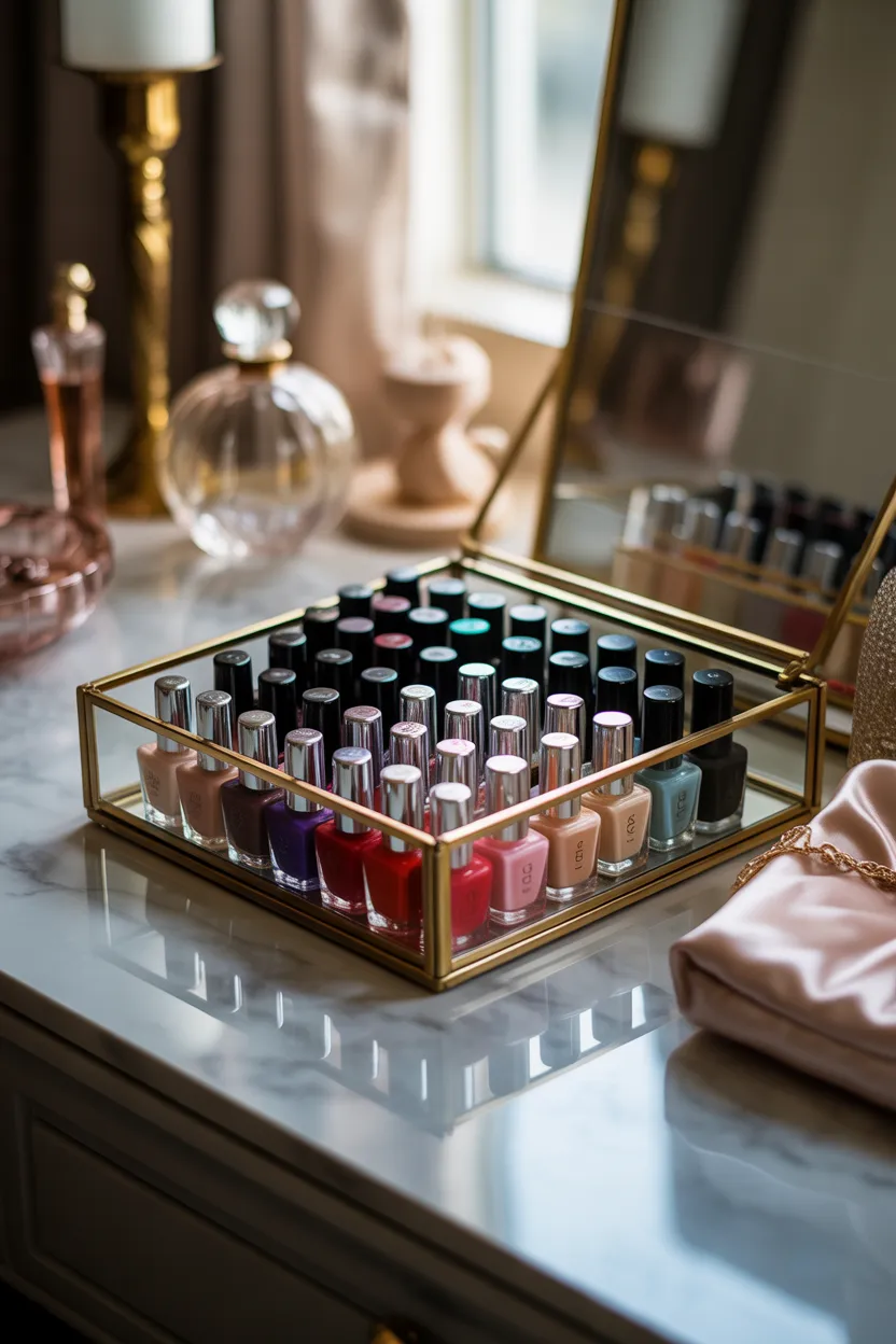 For a smaller collection, I prefer using a glass box. It keeps my favorite shades protected while also looking neat on display.