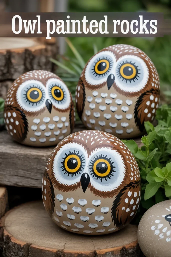 Owl designs are detailed but very rewarding. I use round stones and paint big eyes and feather patterns. These give a natural woodland feel and work well in garden corners or bookshelves.