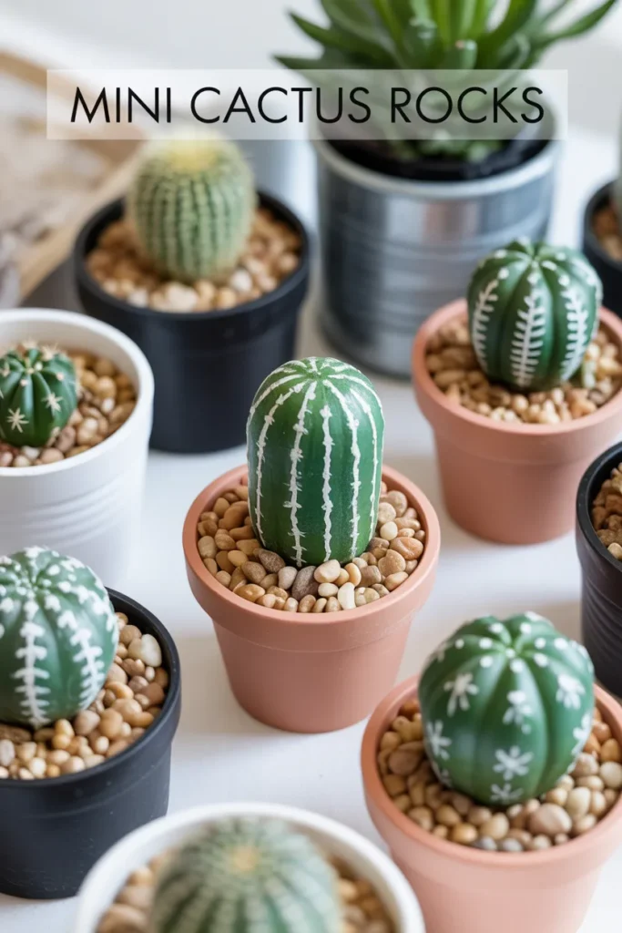 I create fake cactus arrangements using painted green rocks. I place them in small pots and add white dots for texture. It’s a no-maintenance plant idea that still looks stylish indoors.