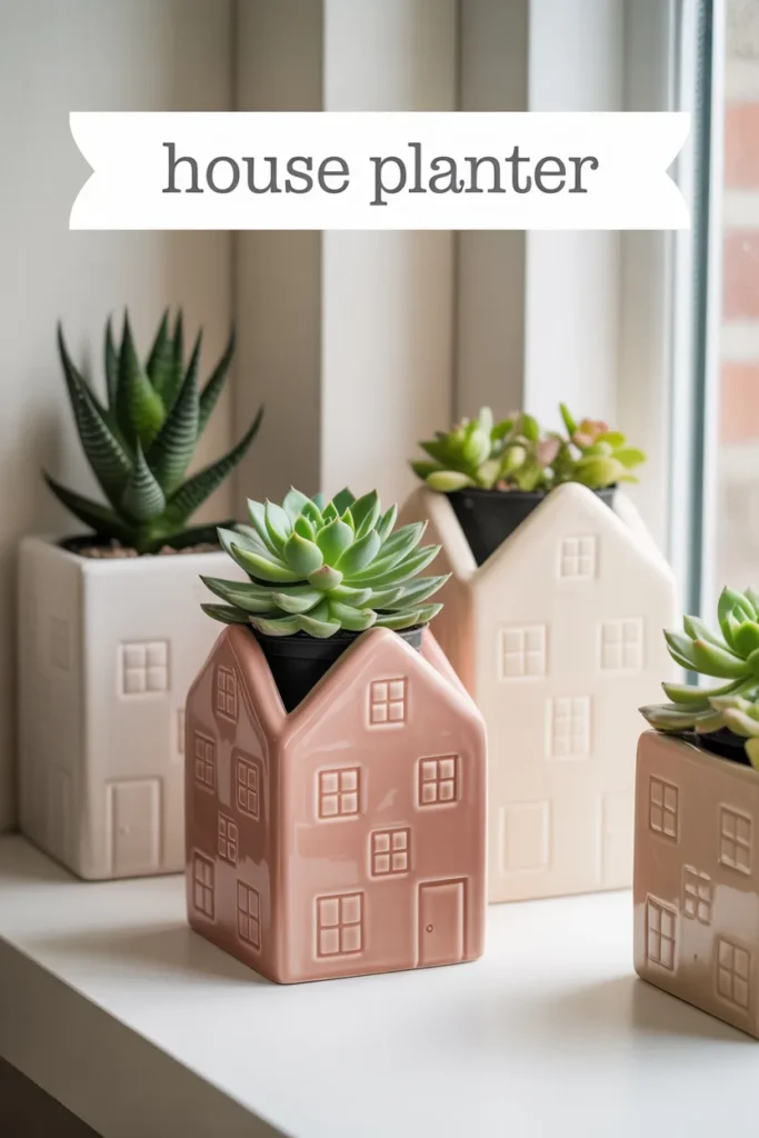 House-shaped planters are fun and decorative. I place them on shelves or desks for a cozy look.