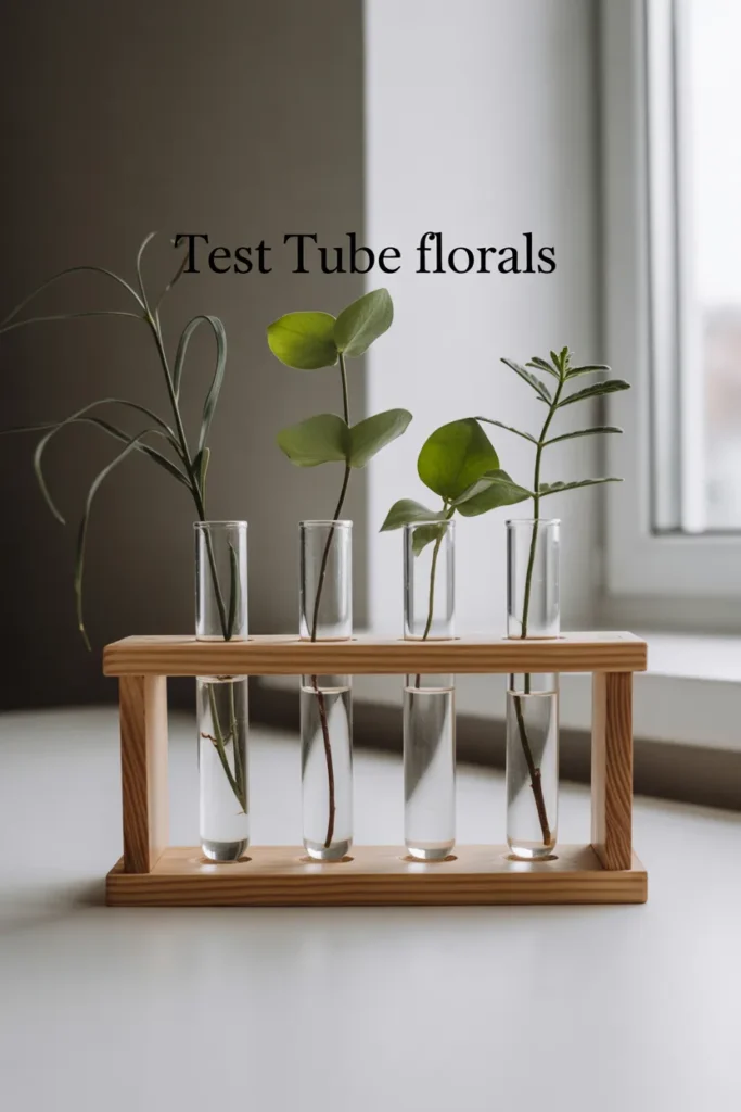 I like using test tube floral setups indoors because they are simple and clean. They work well on desks or kitchen counters.