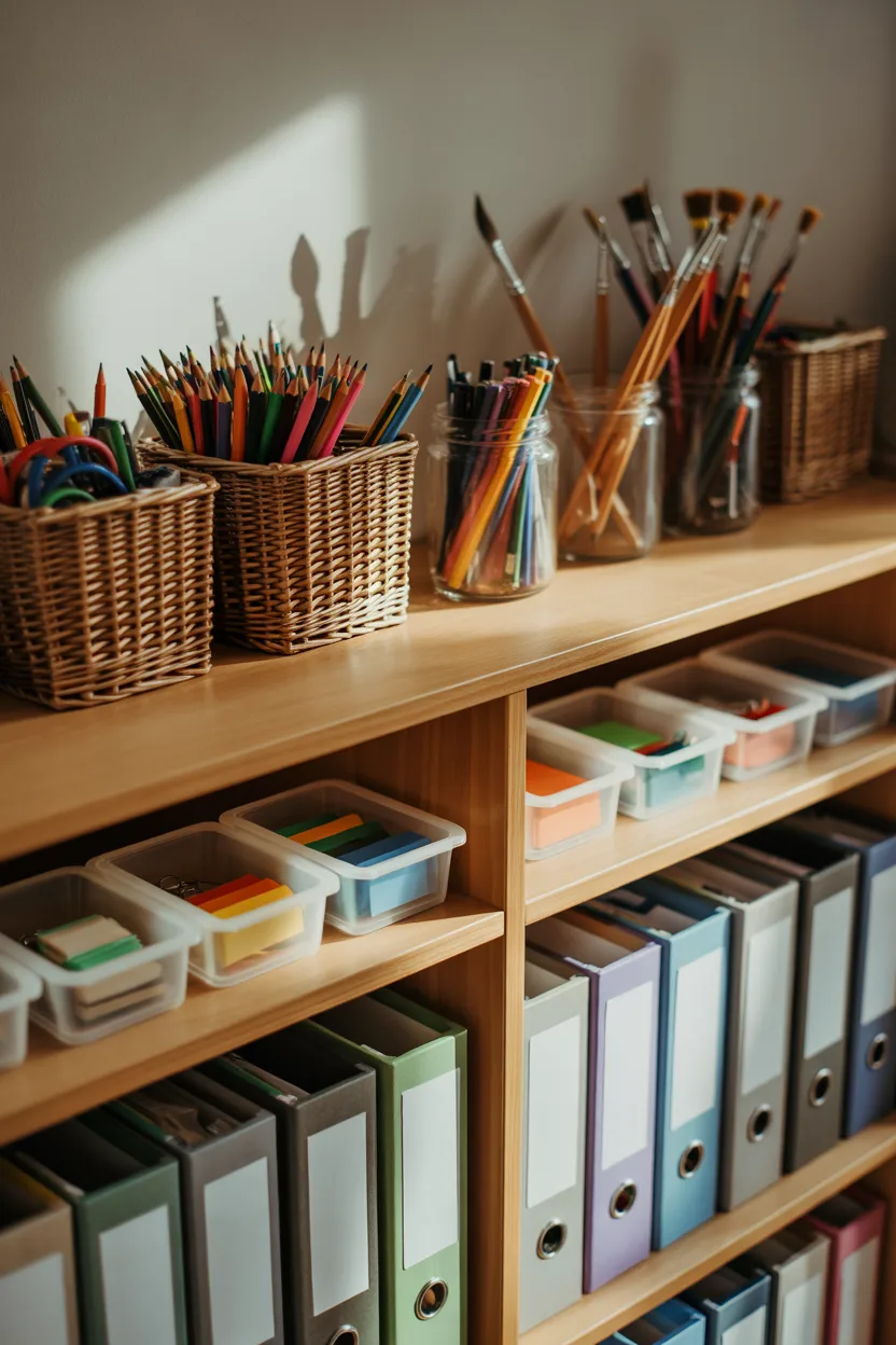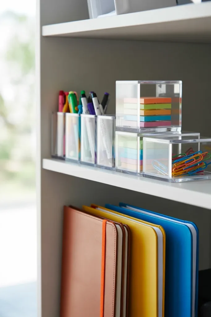 I’ve found that clutter disappears when everything has a fixed place. A shelf system with labeled bins keeps my notebooks and supplies easy to access.