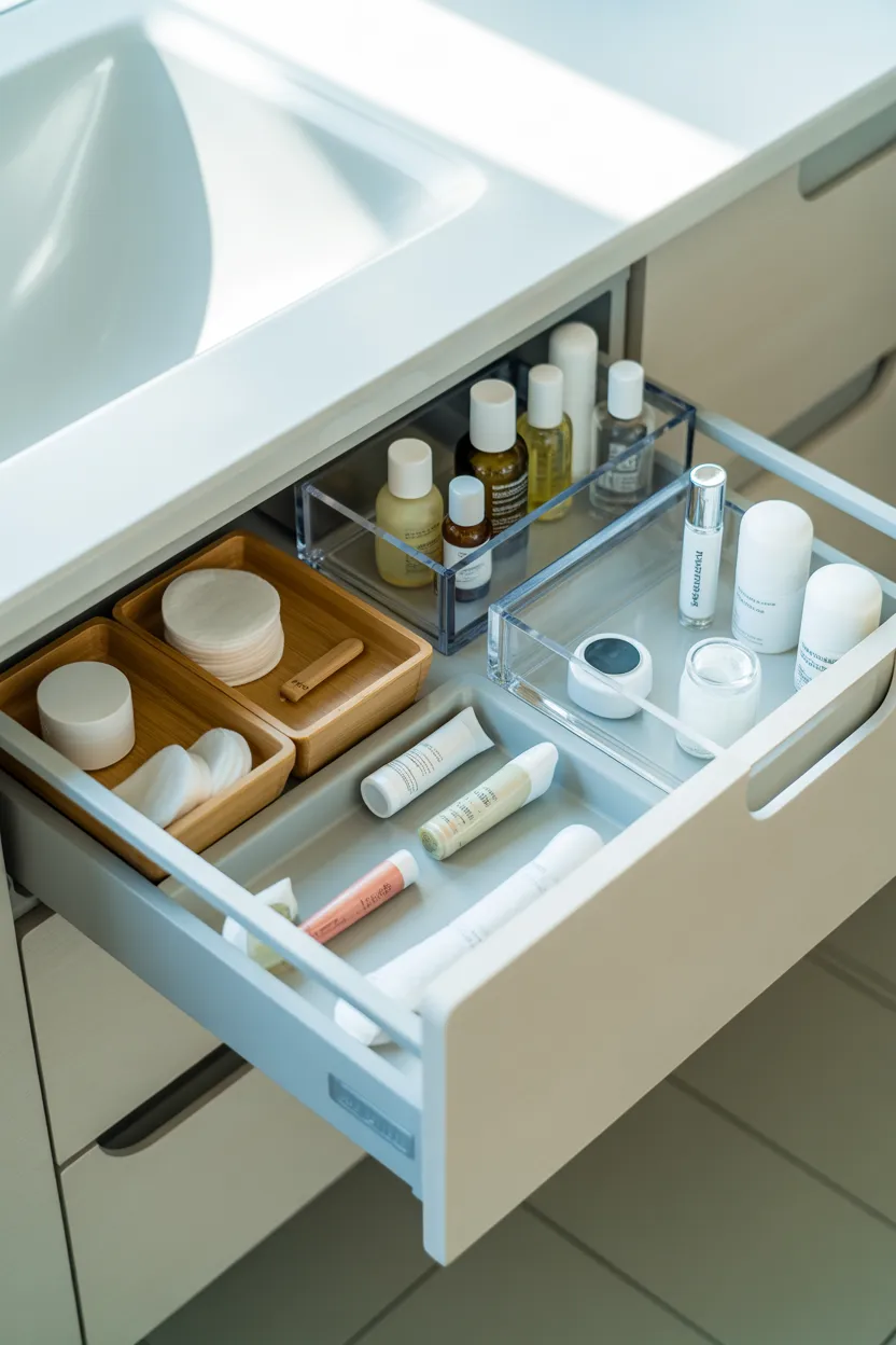 Messy drawers slow down your routine and make small items hard to find. Using small bins to divide a drawer into sections creates clear zones for daily essentials. This setup keeps everything separated and easy to grab. It works especially well for toiletries and personal care items.
