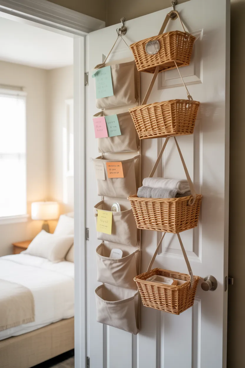 The back of your bedroom door can hold more than you think. Adding racks and small baskets creates a compact station for everyday items like notes, tools, or supplies. It keeps surfaces clear while making frequently used items easy to access.