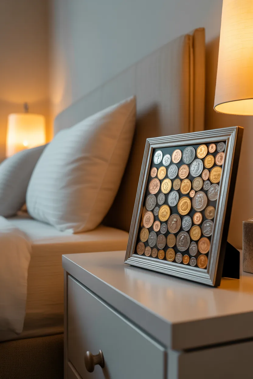 Loose coins often scatter across surfaces, creating unnecessary mess. A simple shadow box frame can turn spare change into a neat and decorative storage solution. Adding a label gives it purpose while keeping everything contained in one place. It’s both functional and visually appealing for dressers or nightstands.