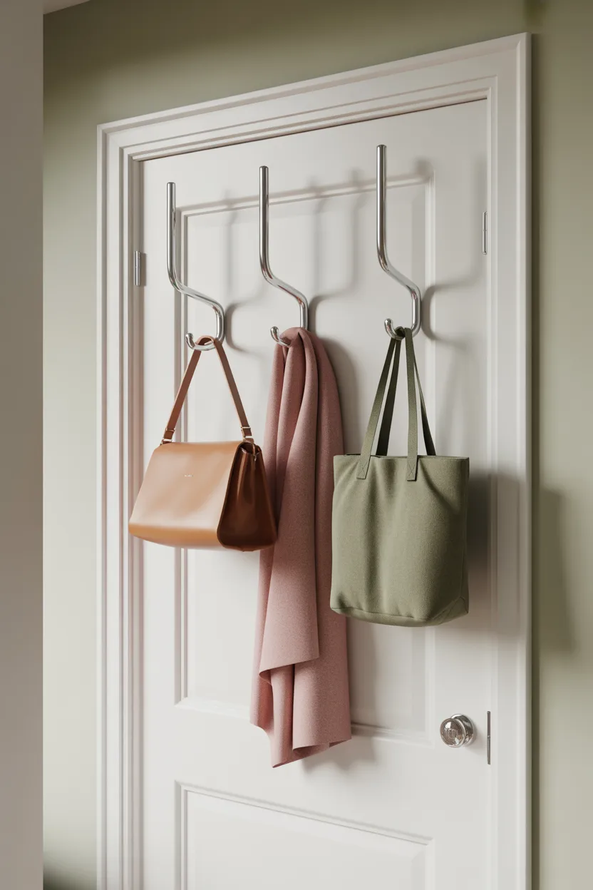 Bedroom doors offer valuable vertical storage space. Adding rods or hooks allows you to hang accessories like bags, scarves, or tools. This keeps items off the floor while staying easily accessible.