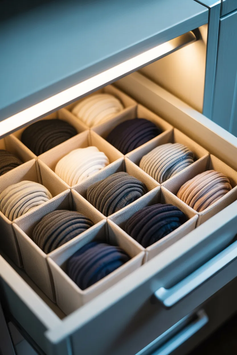 Clothing drawers quickly become messy without proper organization. A divided box keeps socks and small garments neatly separated. This saves time and prevents items from getting mixed up.